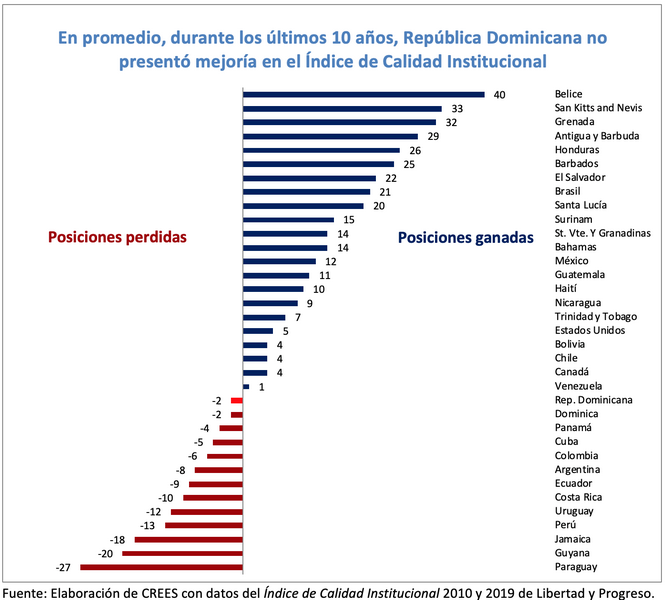 [[{“type”:”media”,”view_mode”:”media_original”,”fid”:”6910″,”attributes”:{“alt”:””,”class”:”media-image”,”style”:”height: 592px; width: 657px;”}}]] Según el Índice de Calidad Institucional, durante los últimos 10 años, República Dominicana ha mostrado deterioro en los progresos institucionales, mientras que 22 de 35...
