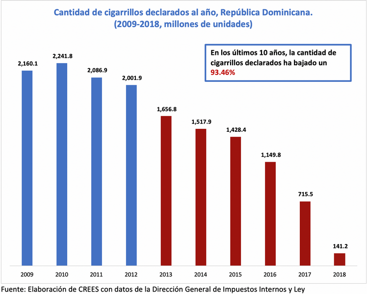 [[{“type”:”media”,”view_mode”:”media_original”,”fid”:”6915″,”attributes”:{“alt”:””,”class”:”media-image”,”style”:”height: 527px; width: 657px;”}}]] En la gráfica de hoy se presenta la cantidad de cigarrillos declarados a la Dirección General de Impuestos Internos (DGII) del 2009 al 2018....