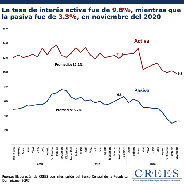 [[{“type”:”media”,”view_mode”:”media_original”,”fid”:”7935″,”attributes”:{“alt”:””,”class”:”media-image”,”style”:”height: 658px; width: 657px;”}}]] La gráfica del día de hoy muestra la tasa de interés activa y pasiva promedio ponderado a noviembre del año 2020. En este mes la...