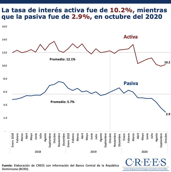 La gráfica muestra la tasa de interés activa y pasiva promedio ponderado a octubre del año 2020. En este mes la tasa de interés activa fue de 10.2%, mientras...