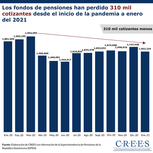 [[{“type”:”media”,”view_mode”:”media_original”,”fid”:”8001″,”attributes”:{“alt”:””,”class”:”media-image”,”style”:”height: 657px; width: 657px;”}}]] Según los datos de la Superintendencia de Pensiones de República Dominicana (SIPEN), en enero del 2021 se registraron 1,652,224 cotizantes en los fondos de pensiones;...