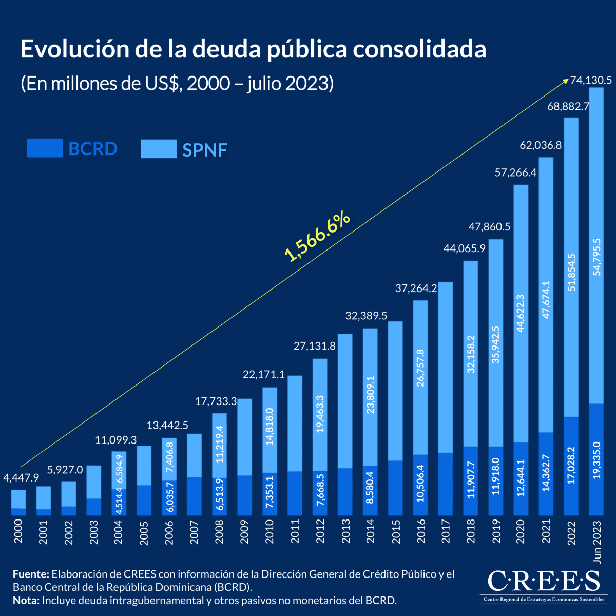 Evolución de la deuda pública consolidada a julio de 2023 La deuda pública consolidada (incluyendo deuda intergubernamental) a julio de 2023 ascendió a US$74,130.5 millones. La misma está compuesta...