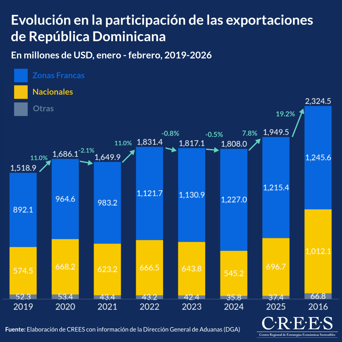 Las exportaciones crecen 19.2% interanual a febrero De acuerdo con datos de la Dirección General de Aduanas (DGA), en el período enero – febrero de 2026, las exportaciones totales...