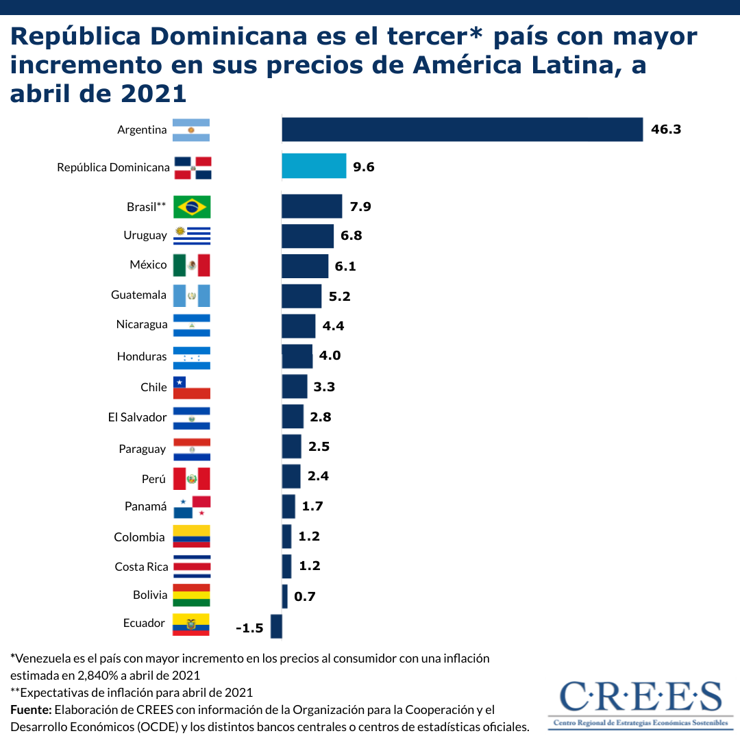 En abril de 2021, República Dominicana fue el tercer país con mayor incremento es sus precios en América Latina. Como se puede observar en la gráfica, a abril de 2021 el país tuvo una la inflación interanual de 9.6%, solo superada por Argentina (46.3%) y, aunque no se incluye en la gráfica, Venezuela (2,840%).
