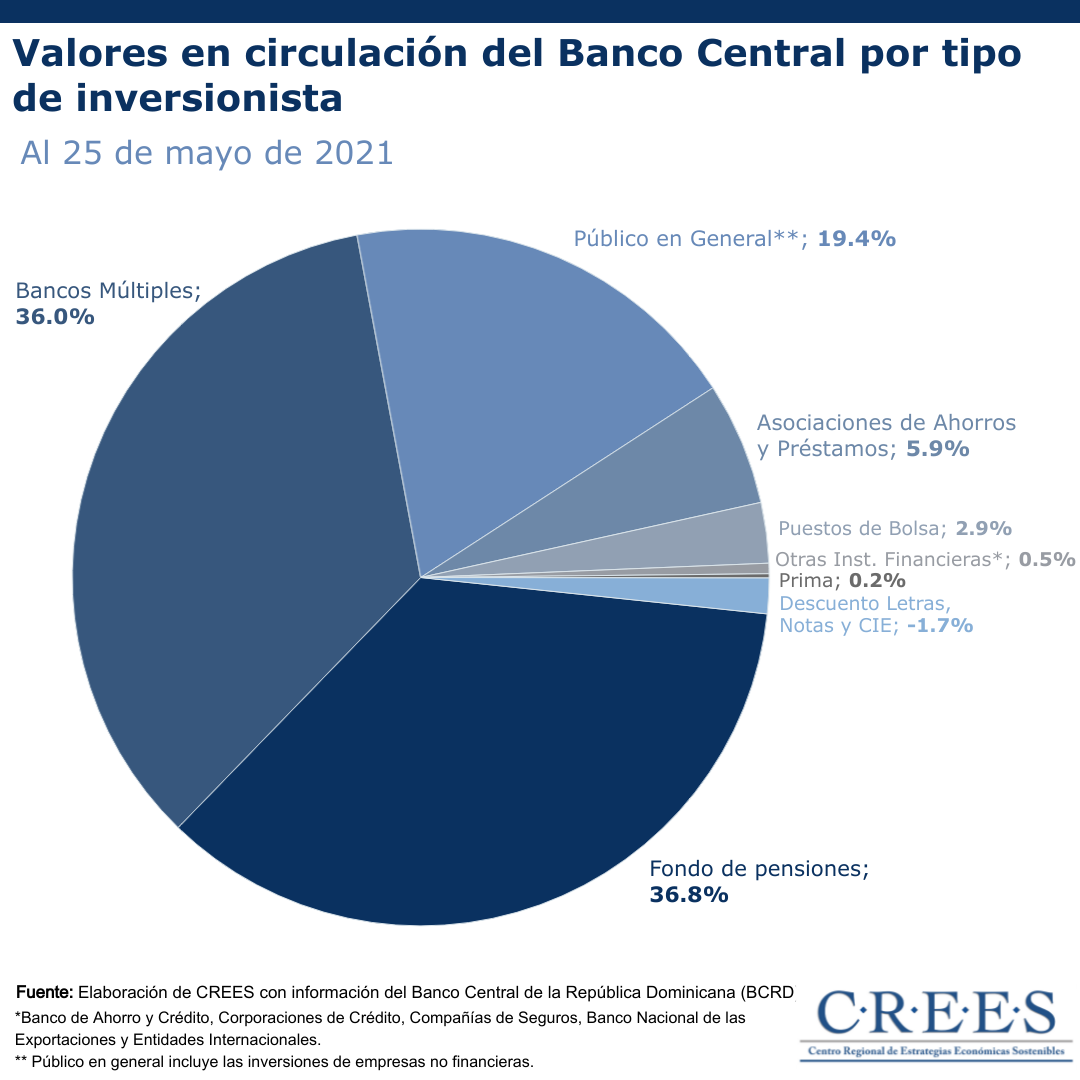 Al 25 de mayo de 2021 el total de valores en circulación, o títulos de deuda del Banco Central de la República Dominicana fue de RD$790,833.3 millones (US$13,862.9 millones), de los cuales, los fondos de pensiones y las instituciones del sistema financiero poseen un 79.2% de estos títulos. La concentración de los instrumentos entre estas instituciones refleja las limitaciones de inversión que existen en el país. Es decir, el mercado de instrumentos financieros dominicano está limitado, en parte, por la ausencia de reglamentos para el mercado de valores y por la existencia de largos procesos burocráticos que crean desincentivos a la realización de colocaciones particulares.