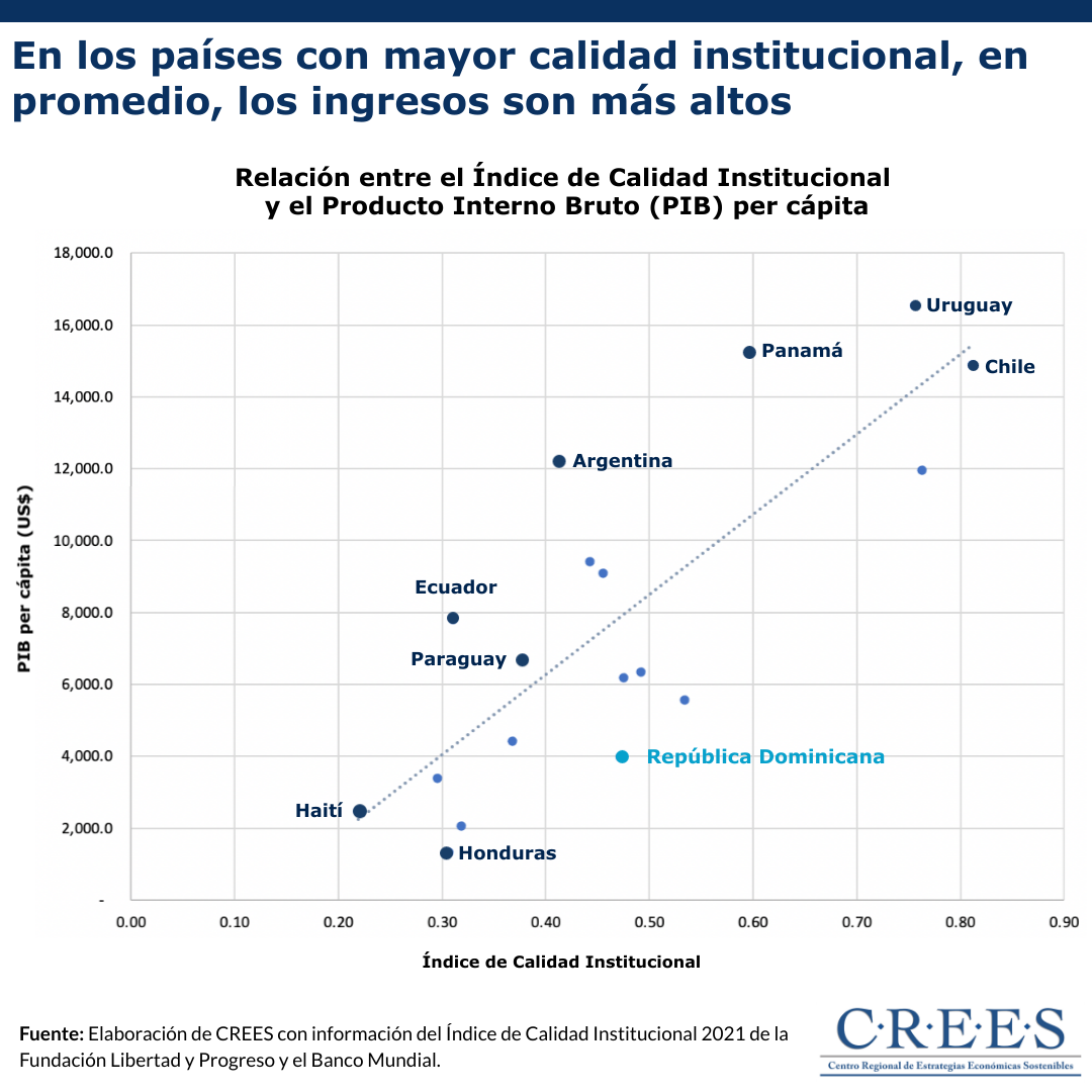 La calidad de las instituciones es clave para el desarrollo de una economía. Solo con instituciones fuertes, que se mantengan constantes a través del tiempo, una economía podrá desenvolverse de la mejor forma. En la gráfica del día de hoy se muestra una relación entre el promedio de la puntuación en el Índice de Calidad Institucional y el PIB per cápita de los últimos 5 años. Como se observa, en aquellos países con un orden institucional más fuerte, en promedio, los ingresos son más altos.