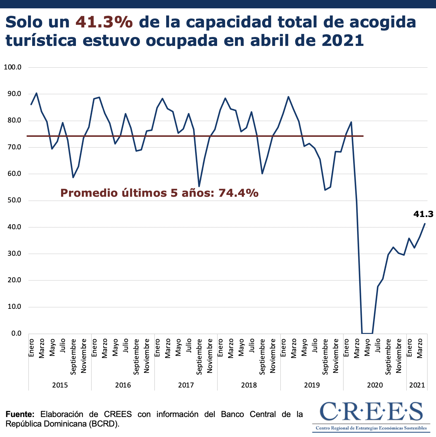A partir del primer trimestre del 2020 y, como resultado del impacto de la pandemia de COVID-19 en la industria turística dominicana, la tasa promedio de ocupación hotelera disminuyó a cero por 3 meses (abril, mayo y Junio). Si bien la tasa de ocupación hotelera de abril de 2021 aún está por debajo de los niveles previos a la pandemia, esta ha tenido un recuperación importante en comparación con la prevaleciente en el mismo mes de 2020. Esto puede estar explicado por la efectiva administración de las vacunas a nivel global y la flexibilización o levantamiento de las medidas de restricción de movilidad en muchos países del mundo.