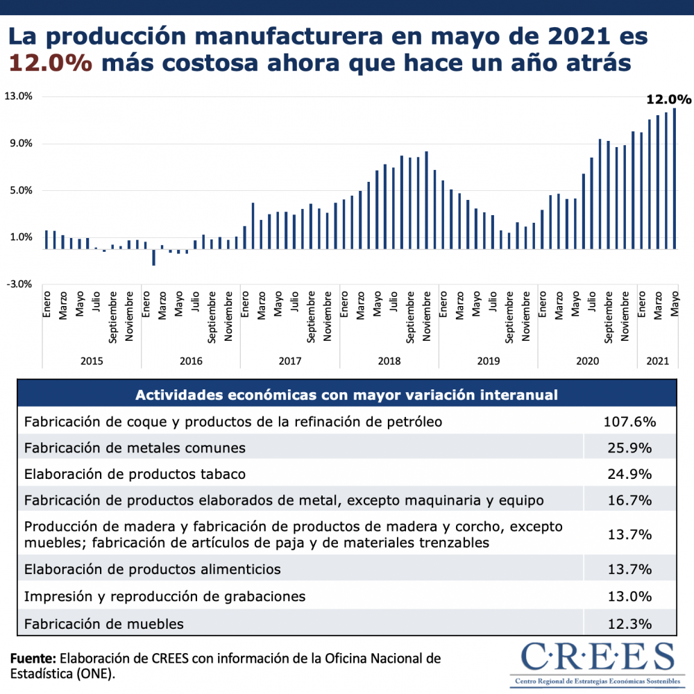 En mayo del 2021 el Índice de Precios del Productor (IPP) de las Industrias Manufactureras fue de 136.0, en promedio, reflejando una variación interanual de 12.0%. En otras palabras, la producción manufacturera en República Dominicana es 12.0% más costosa ahora que hace un año atrás; el mayor incremento interanual de precios en la toda serie histórica del índice.