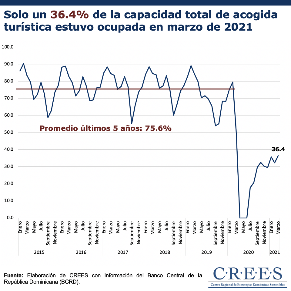La pandemia de COVID-19 se ha convertido en uno de los mayores retos para el turismo dominicano. Si bien la ocupación hotelera aún se encuentra por debajo de los niveles previos, se esperaría que la administración de las vacunas a nivel global continúe influyendo en la gradual flexibilización de medidas y, al mismo tiempo, en las decisiones de viajes de las personas. De igual forma, es importante formular políticas enfocadas a promover la competitividad y reducir los costos para incentivar una mayor recuperación del turismo y de otras industrias afectadas por la pandemia.