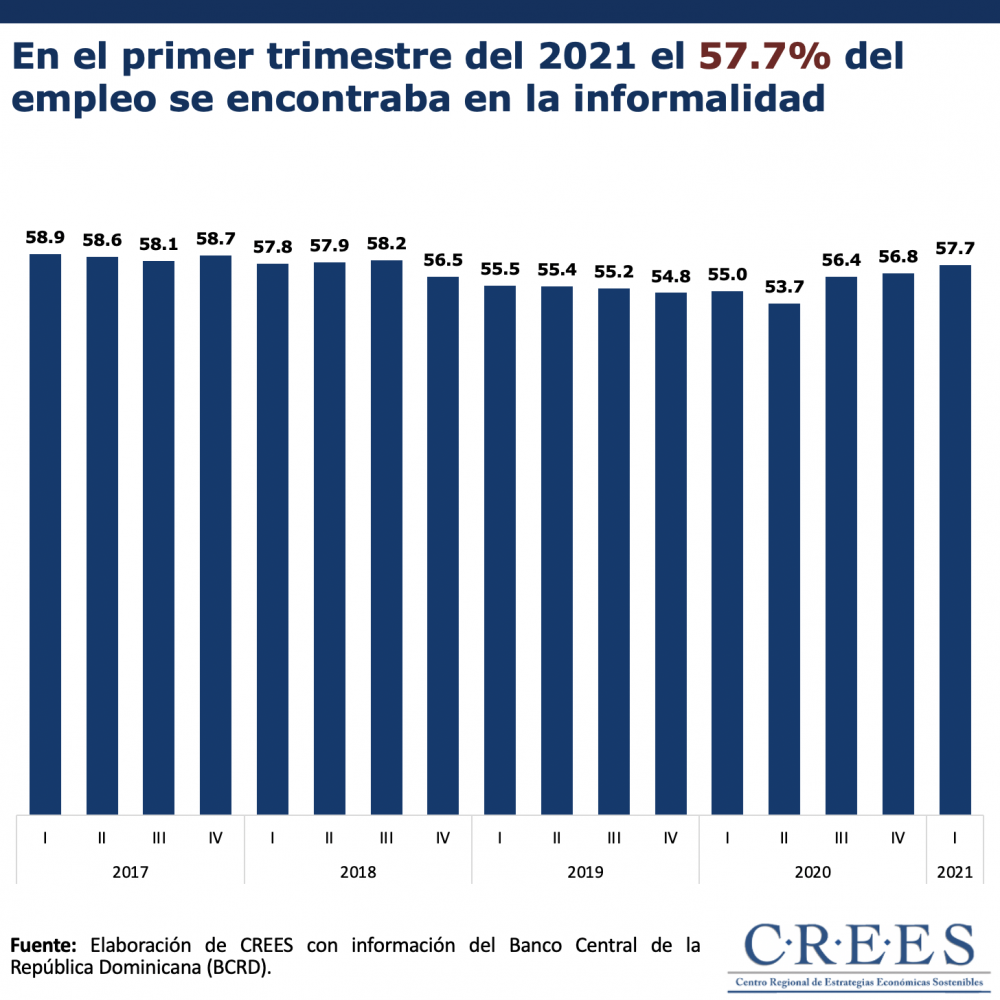 La informalidad en la economía dominicana es un fenómeno estructural relacionado con los altos costos que penalizan las actividades dentro del marco legal y regulatorio. En los últimos cuatro años, las estadísticas del mercado laboral muestran que un promedio de 56.7% del empleo que se mantienen en la informalidad. En adición a esto, las distorsiones en el mercado laboral que ha provocado la pandemia de COVID-19 también han incidido en el aumento de la informalidad en los últimos trimestres.