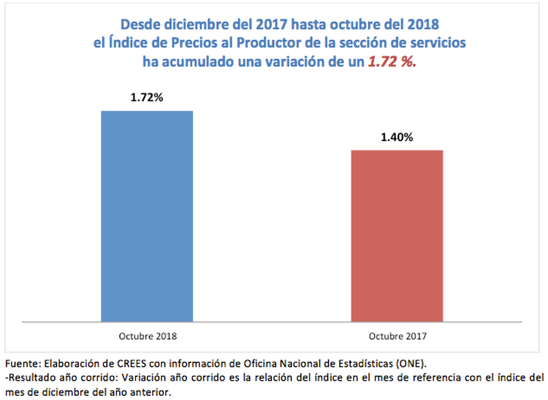 Desde diciembre del 2017 hasta octubre del 2018 el Índice de Precios al Productor (IPP) de la sección de servicios ha acumulado una variación de un 1.72%. En términos interanuales, el IPP de Servicios se incrementó en 3.34% al mes de octubre de 2018. Las actividades económicas que acumularon los principales incrementos fueron: actividades de agencias de viajes y operadores turísticos y servicios de reservas y actividades conexas, con un 8.12 %; reparación de computadoras y de efectos personales y enseres domésticos, con un 6.89 %; actividades de servicio de comidas y bebidas, con un 3.77 %. Mientras que la principal disminución se observó en actividades de alojamiento, -4.70 %, la cual le restó a la contribución de la variación acumulada un 0.20 puntos porcentuales. Según la ONE, el IPP Servicios mide “…el cambio porcentual promedio de los precios de una canasta de servicios característicos de la producción nacional de un período determinado…”. El IPP Servicios tiene cobertura a nivel nacional, pues cubre todas las zonas geográficas del país.
