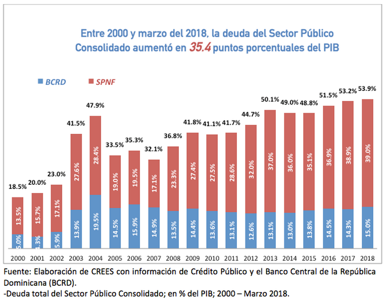 A marzo del 2018, la deuda total del Sector Público Consolidado fue de 53.9% del Producto Interno Bruto, equivalentes a RD$ 42,210.5 millones. La deuda del Sector Público Consolidado(SPC) está compuesta por la deuda del Sector Público No financiero (SPNF), que representó un 39% el PIB; y la deuda del Banco Central (BCRD), que representó un 15%. El incremento de la deuda se debe a los constantes déficits fiscales que se terminan traduciendo en mayor pago de intereses por parte del gobierno y, posteriormente, en mayores impuestos para los ciudadanos. Por esto, desde CREES se promueve a que en el país opte por una Reforma Fiscal Integral que comprenda una Ley de Responsabilidad y Transparencia Fiscal y una Reforma Integral al Código Tributario, con la finalidad de garantizar la sostenibilidad fiscal a largo plazo, incrementar las recaudaciones fiscales y facilitar que el país mantenga un desarrollo económico sostenible.