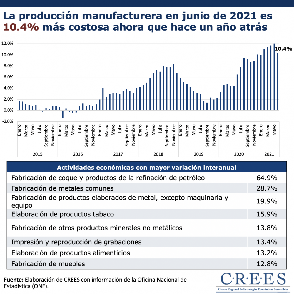 Desde mediados del 2020, el costo de la producción manufacturera ha experimentado un incremento importante como consecuencia del impacto que ha tenido la pandemia de COVID-19 y las políticas fiscales y monetarias expansivas adoptados por muchos Estados del mundo para hacerle frente a la misma, en los precios internacionales de los bienes y servicios; en particular, las materias primas agrupadas en los sectores de energía y metales.