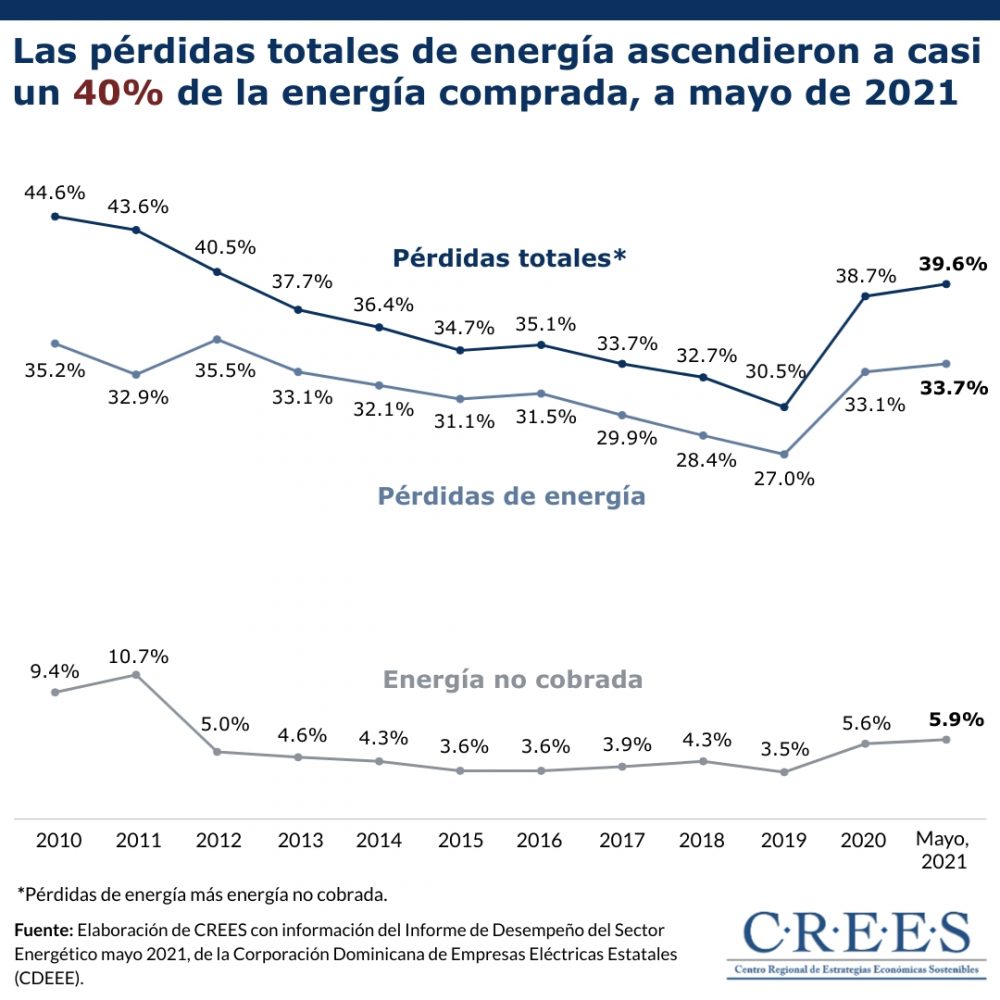 A mayo de 2021, las pérdidas totales de energía eléctrica ascendieron a casi a un 40% (39.6%) de la energía comprada; de los cuales un 33.7% corresponde a las pérdidas de energía y un 5.9% a la energía que fue facturada pero no pudo ser cobrada.