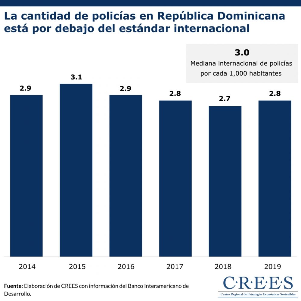 De acuerdo con información del Banco Interamericano de Desarrollo, entre los años 2015 y 2019 la cantidad de policías por cada 1,000 habitantes en República Dominicana se ha reducido de manera consistente, ubicándose en 2.8 en el 2019. Esto significa que la cantidad de policías en el país estuvo por debajo del estándar internacional de 3.0 policías por cada 1,000 habitantes estimado por la Oficina de las Naciones Unidas contra la Droga y el Delito (ONUDC).