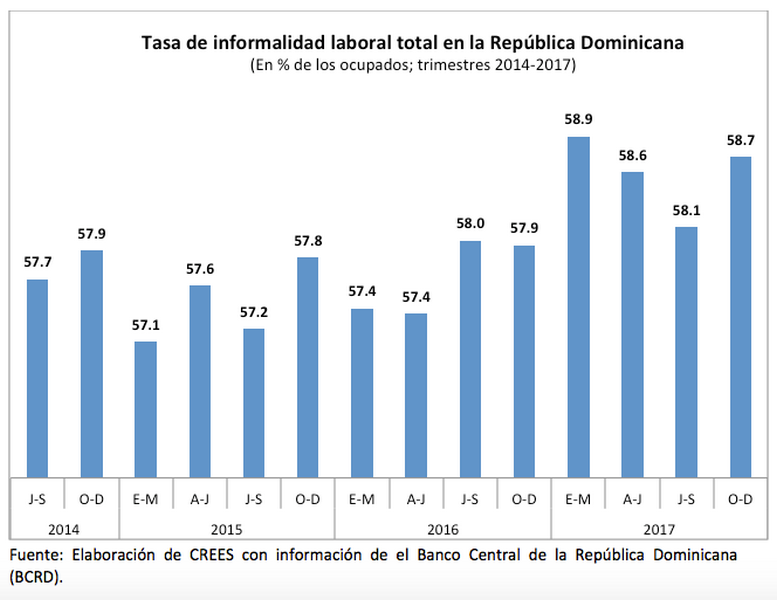 Las cifras de la informalidad laboral total de la economía dominicana indican que esta continúa en ascenso. En 2017 el promedio para los cuatro trimestres del año fue 58.6%, superior al 56.9% de 2016. Los datos se refieren a la informalidad total, ya que miden la cantidad de empleados que están laborando en empresas informales y dentro de las formales; estos últimos son establecimientos formales, pero a cuyos dueños los costos del sistema legal les impulsan a realizar parte de sus actividades fuera del mismo.