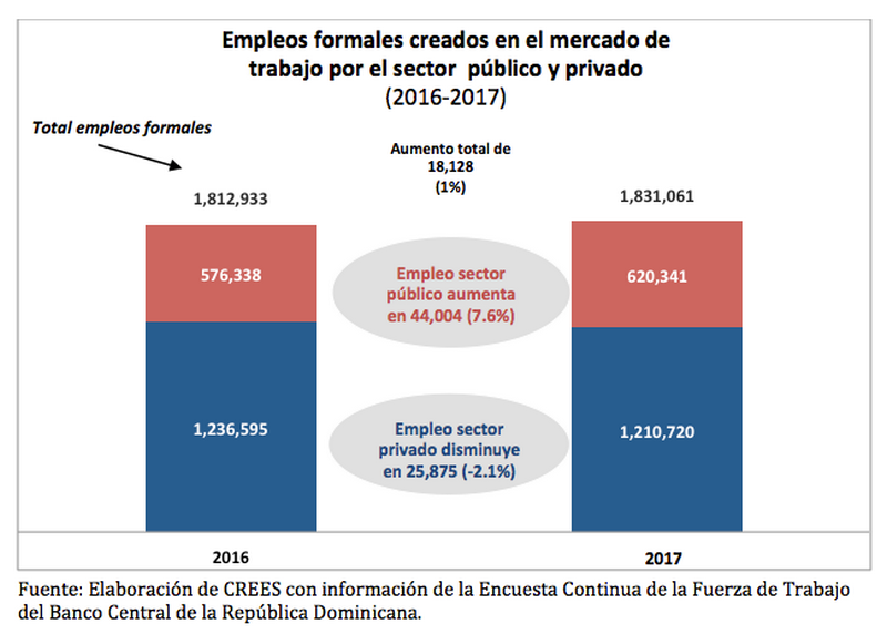 Las condiciones prevalecientes en la economía eliminaron de la formalidad 25,875 empleos privados en 2017. Los únicos empleos formales creados fueron en el sector público. Más de 44,000 nuevos empleados pasaron a depender de los recursos de los contribuyentes en el año 2017, un incremento de 7.6% con relación al 2016.