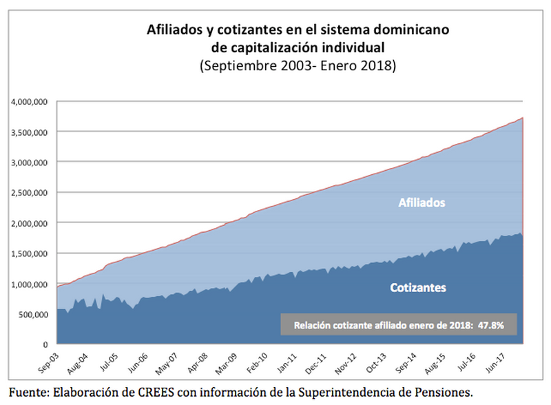 Otra pregunta relevante sobre el efecto de la informalidad está relacionada con la protección social. ¿Cómo afecta la informalidad que prevalece en la economía al sistema de seguridad social? Un sistema de pensiones, cualquiera que este sea, necesita ahorros. Mayor informalidad dificulta cotizar. El porcentaje de cotizantes con relación al total de afiliados ha promediado 48.3% en los últimos cinco años, y para 2017 el promedio fue 48.9%. Ese porcentaje de cotizantes es bajo con relación a los afiliados y a la población en edad de trabajar (PEA). En 2016, por ejemplo, mientras en Chile cotizaba el 64.8% de la PEA en los fondos de pensiones, en República Dominicana únicamente lo hacía el 33.8%.