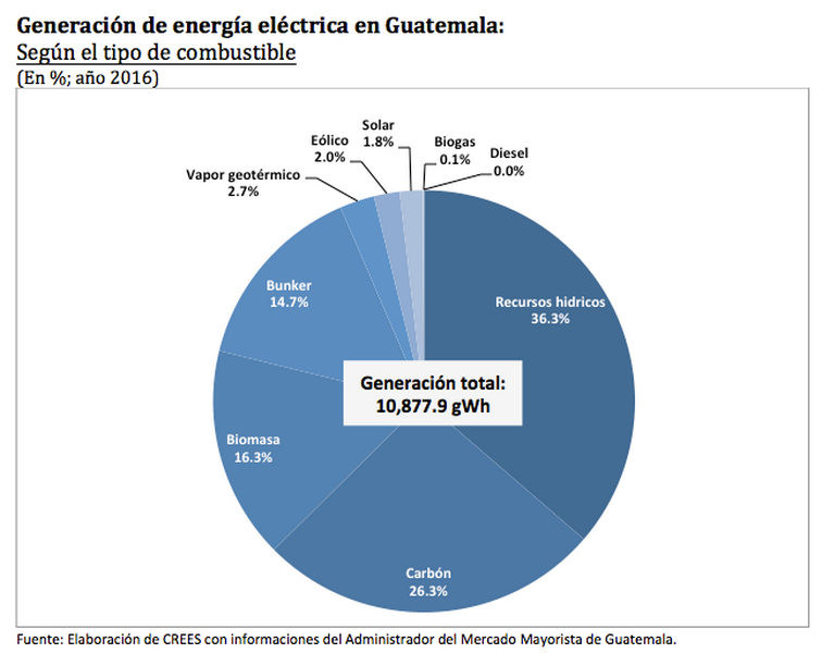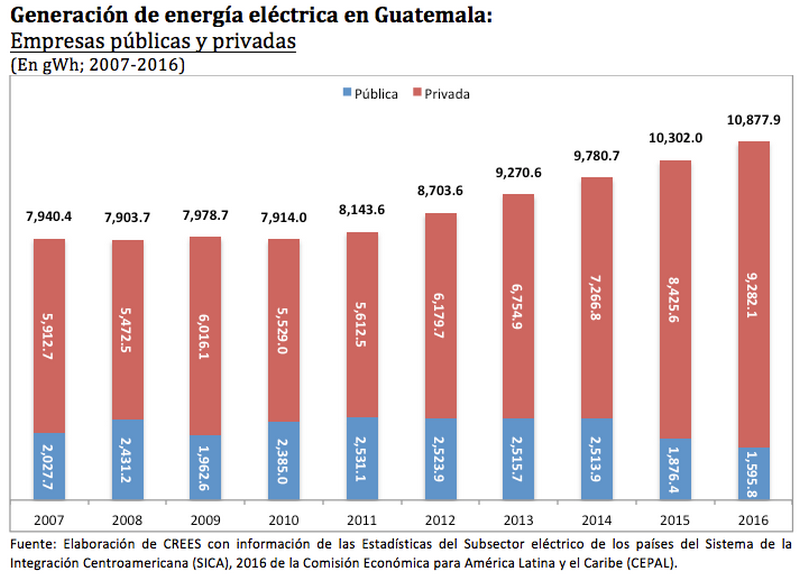 Entre el año 2007 y el 2016, la generación de electricidad en Guatemala se incrementó en un 37%. De los 10,877.9 gWh generados durante el año 2016, el 85.3% fue producido por empresas privada y el 12.3% se exportó a otros países. En adición, durante el año 2016, último año con información disponible, Guatemala fue el mayor generador de energía eléctrica de América Central, generando el 21.3% de los 50,967.9 gWh de la región.