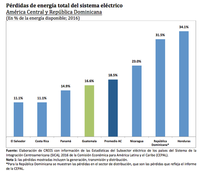 Durante el año 2016, las pérdidas totales de energía eléctrica en Guatemala representaron el 16.6% de la energía disponible, mientras, en promedio, América Central las pérdidas fueron de 18.5%. Honduras fue el país de mayores pérdidas (34.1%) y El Salvador el de menores pérdidas (11.1%). Las pérdidas de Guatemala representaron cerca de la mitad de las pérdidas de electricidad de las EDE de República Dominicana.