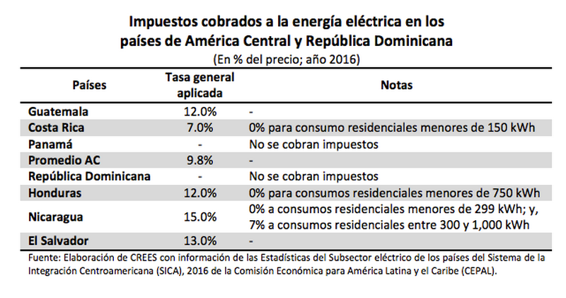 La tasa promedio del impuesto al consumo de energía cobrada en América Central, sean IVA o impuestos selectivos al consumo según el país, es de 9.8% del precio. Nicaragua aplica la mayor tasa, 15%, y Costa Rica la menor, 7%. En cualquier caso, los impuestos terminan encareciendo el precio al que deben comprar la energía los hogares y las actividades productivas.