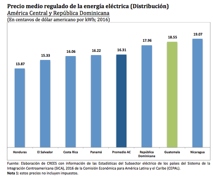 Cuando se compara con América Central, el precio medio de distribución de energía eléctrica en Guatemala es, en promedio, el segundo más caro de esa región y un 13.7% superior al promedio. El precio medio en América Central es de 16.31 centavos de dólar por kilovatio por hora (kWh). El país con el precio más caro de la energía fue Nicaragua, 19.07 centavos de dólar por kWh, y el de menor precio fue Honduras, con 13.87 centavos de dólar por kWh[17].