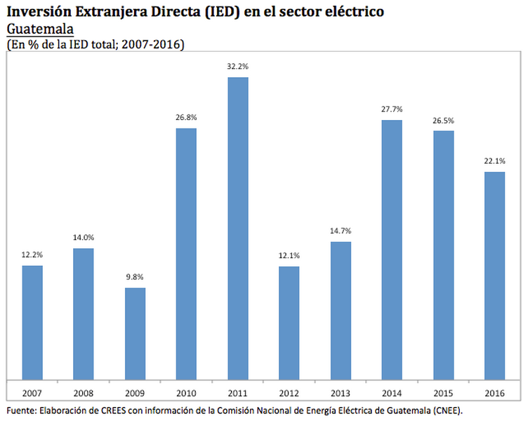 Es importante resaltar el flujo constante IED dirigida al sector eléctrico que recibe Guatemala. Este constante flujo de inversión al sector eléctrico estaría mostrando no solo que es rentable invertir en el sector sino también que existe confianza en el manejo de las instituciones públicas que regulan y coordinan el sector eléctrico Guatemalteco.