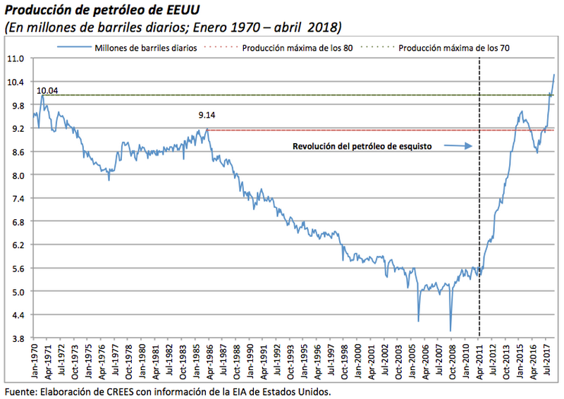 Entre los años 2006-2008 Estados Unidos producía unos 5 millones de barriles de petróleo al día y era un importador neto de petróleo. Con la adopción de las nuevas tecnologías, inició un incremento constante de la producción, sobrepasando los 10 millones de barriles por día, en julio de 2017. En la actualidad, EEUU ha llegado a producir unos 10.85 millones de barriles por día y se espera que la producción se incremente a 11.9 millones de barriles para el 2019.