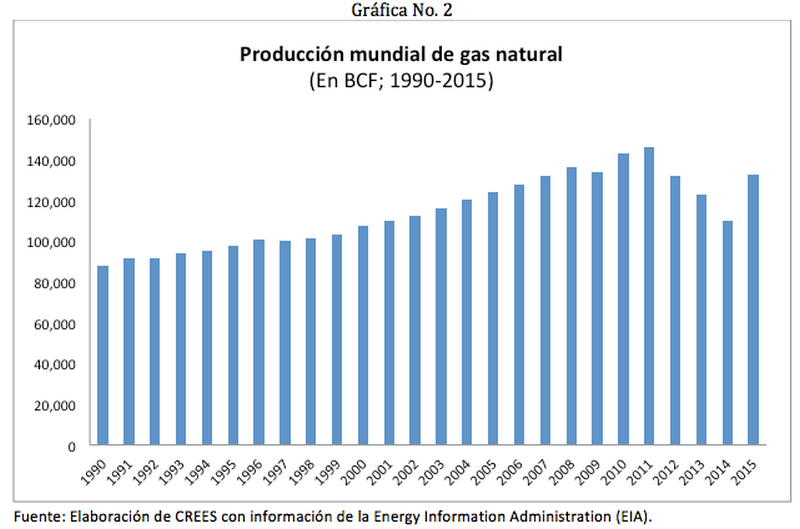 El precio ha disminuido y la producción mundial se ha incrementado. Una importante proporción de la producción total de gas natural, así como la disponibilidad para abastecer más mercados se debe al desarrollo de la industria de GNL de Estados Unidos. La Gráfica No. 2 proporciona una idea de la tendencia al crecimiento que ha tenido la producción mundial.