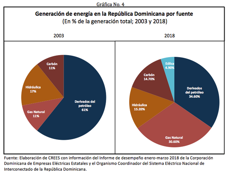En la Gráfica No. 4 es apreciable de qué forma en República Dominicana también se ha incrementado la proporción de generación empleando gas natural. Durante el primer trimestre de 2018, la proporción de generación a partir de gas natural es muy similar a la de derivados de petróleo. La comparación está hecha tomando como referencia el año 2003, cuando fue introducido este combustible como fuente de generación de electricidad en el país y solo representaba el 11% de la matriz de generación local.