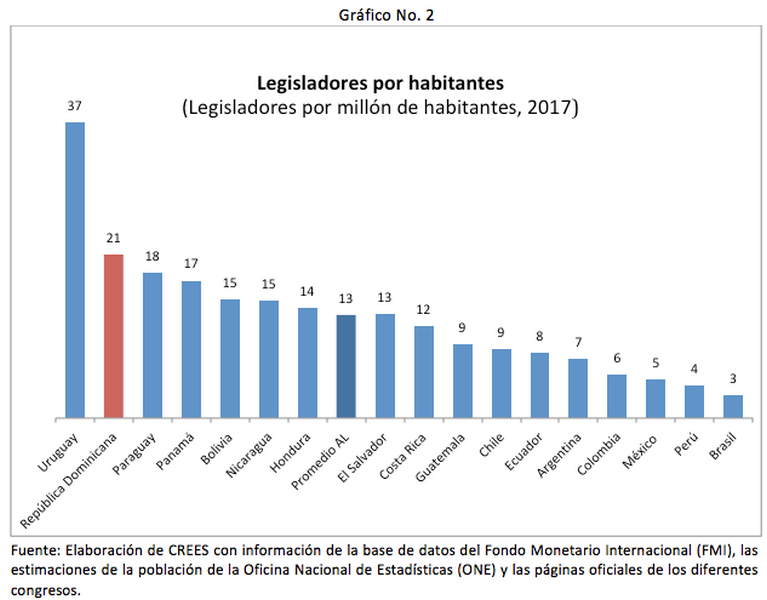 Con la finalidad de poder tener una idea de la dimensión de cada congreso, es necesario presentar el número de legisladores como proporción de los habitantes de cada país. Esta medida ayuda a apreciar el exceso de representantes que pueden tener los ciudadanos de los diferentes países. El promedio de legisladores por millón de habitantes en América Latina es de 13. En el caso de Costa Rica, por ejemplo, aunque posee el menor número de legisladores, tiene 12 representantes por millón de habitantes, número similar al promedio de América Latina. Uruguay y República Dominicana presentan la mayor cantidad de legisladores por millón de habitante con 37 y 21, respectivamente. Mientras que Brasil es el de menor cantidad, con 3 legisladores por millón de habitantes.
