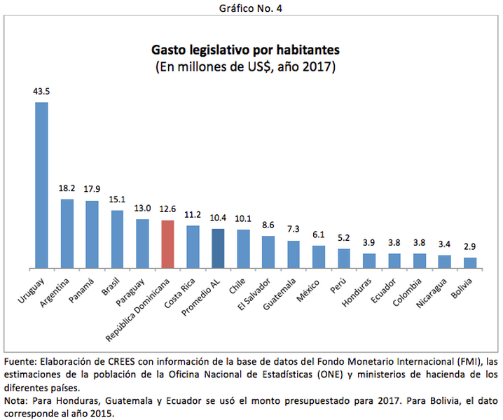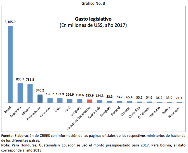 El gasto legislativo representa todos los recursos destinados a cubrir las operaciones de los congresos. En América Latina, los tres países con mayores gastos legislativos en 2017 fueron: Brasil con US$3,165.9, Argentina con US$ 805.7 millones; y México con US$781.8 millones. La República Dominicana fue el octavo país con mayor gasto legislativo de los 17 países analizados, con un gasto ejecutado de US$135.9 millones. Este nivel es alto cuando es comparado con el de economías similares. En efecto, el nivel de gasto legislativo de República Dominicana fue 123.7% superior al de los países de Centroamérica, cuyo promedio fue de US$60.8 millones en 2017.