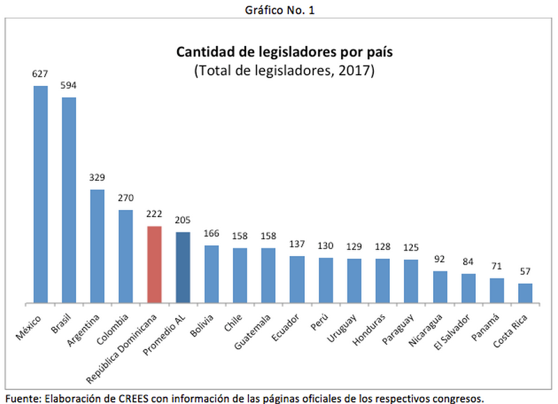 Para iniciar el análisis, es imprescindible conocer el número de legisladores de los diferentes poderes legislativos de los 17 países evaluados. Como se aprecia en el Gráfico No. 1, los países con mayor número de legisladores son México (627) y Brasil (594). Mientras que Costa Rica es el país que tiene la menor cantidad de parlamentarios (57). En cuanto a la República Dominicana, su congreso registra un total de 222 legisladores, divididos entre la Cámara de Diputados con 190, y el Senado con 32. Esto nos convierte en el quinto país con mayor número de legisladores en América Latina.