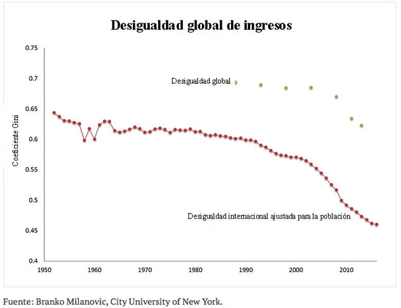 El indicador más comúnmente utilizado de la desigualdad de ingresos es el Coeficiente Gini, que mide la desigualdad de ingresos en una escala que parte de 0 (esto es, todos los ingresos son iguales) y termina en 1 (es decir, una persona concentra todo el ingreso). Una forma de medir la desigualdad de ingresos global, explica Branko Milanovic de la City University de New York, es calcular un promedio ajustado para la población de los valores de Gini de cada país individual. Como puede ver, el declive en la desigualdad de ingresos a nivel mundial empezó en la década de 1980 y coincide con un periodo de mayor libertad económica e integración conocida como “globalización”. Sin embargo, esta medida de desigualdad de ingresos, llamémosla desigualdad entre países, es un tanto engañosa porque asume que todos dentro de cualquier país obtienen el mismo ingreso. Para obtener una idea de la desigualdad a través de la raza humana, la desigualdad de ingresos entre países debe ser ajustada para la desigualdad de ingresos dentro de los países. En esa medida, la desigualdad de ingresos global empieza a caer un poco después —luego del principio del nuevo milenio. Aún así, ambas medidas de desigualdad de ingresos a nivel global muestran una tendencia hacia abajo. Considerando esto, Milanovic concluye, “Estamos presenciando el primer declive en la desigualdad global entre los ciudadanos del mundo desde la Revolución Industrial”.