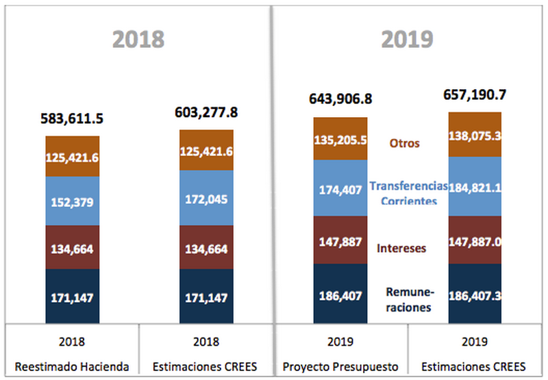 En CREES estimamos que existen algunas partidas dentro del gasto público que pudieran presentar una mayor ejecución presupuestaria de lo estimado o, bien, existen riesgos que implique mayor gasto público en 2019. Estas partidas son: