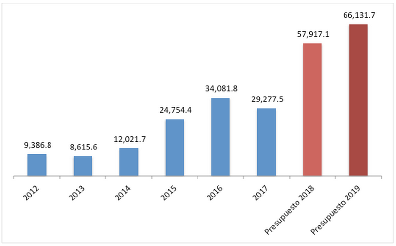 Transferencias o subsidios a las EDES: en el proyecto de presupuesto se estima un precio de petróleo (referencia de precios del West Texas Index-WTI) de US$60.50 por barril. En las condiciones actuales y viendo las perspectivas al año 2019, parecería que es una cifra optimista. La agencia de Administración de Información de Energía en EEUU estima que el precio promedio del petróleo WTI será de US$69.56 el barril para 2019. Algo similar ocurrirá en este 2018 cuando el gobierno incluyó en el presente presupuesto un precio de US$49.20 por barril de petróleo, mientras que el promedio del año ronda los US$66.47 por barril, a la fecha de publicación de este análisis.