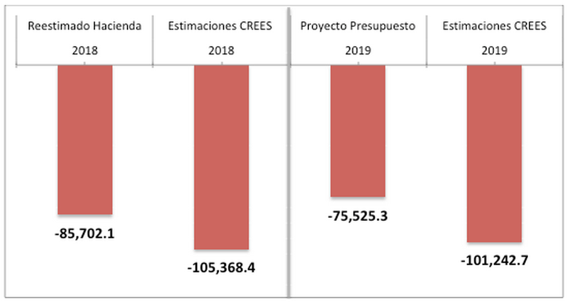 10- La realidad es que el déficit fiscal para 2018 rondará el 2.7% del PIB y presentar un presupuesto con 1.7% al año siguiente implicaría un ajuste de un punto porcentual del PIB. Esto parece optimista si entendemos que los ingresos parecen sobreestimarse y los gastos subestimarse. En CREES estimamos que el déficit fiscal para el 2019 en RD$101,242.7 millones, lo que equivale a 2.3% del PIB, en lugar del 1.7% que se incluye en el Proyecto de Presupuesto del Estado 2019.