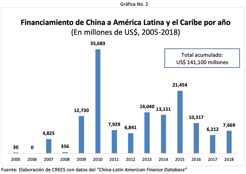 El Diálogo Interamericano y la Universidad de Boston mantienen la China-Latin America Finance Database, una base de datos sobre el financiamiento de China a países de la región. Los datos que nutren la base provienen del China Development Bank (CDB) y del Eximbank. De acuerdo con esas estadísticas, el financiamiento acumulado entre los años 2005 y 2018 destinado a América Latina y el Caribe alcanzó US$141.1 millardos (billones en inglés). El 82% de ese financiamiento provino del CDB y el restante 18%, del Eximbank.