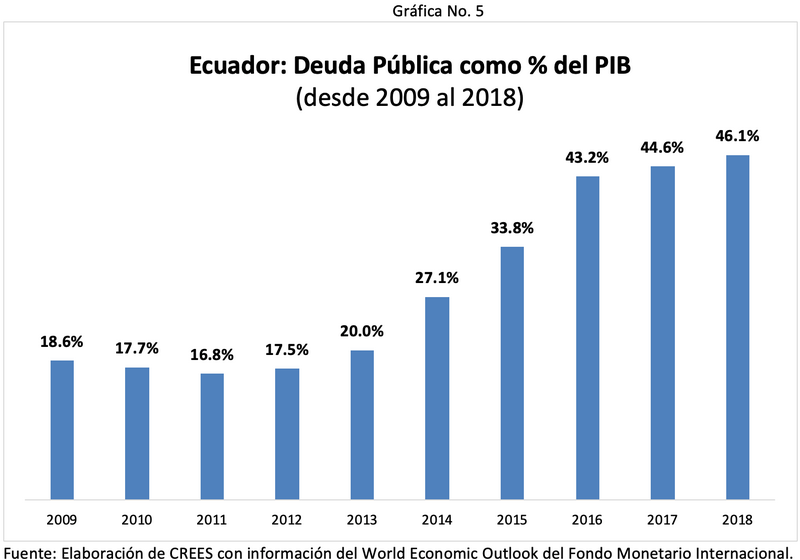 De igual forma, entre 2013 y 2018, la proporción de la deuda pública ecuatoriana como porcentaje del PIB pasó de 20% a 46%. El peso de la deuda en las finanzas públicas se hizo evidente mediante el incremento en la razón gasto en intereses como porcentaje de los ingresos tributarios, al pasar de 9.7% en 2014 a 18.7% en 2018. Esta última medida proporciona una mejor idea de cómo está incidiendo la deuda sobre el manejo de las finanzas del país, al observar su incidencia sobre los ingresos tributarios y sobre el resto de los gastos.