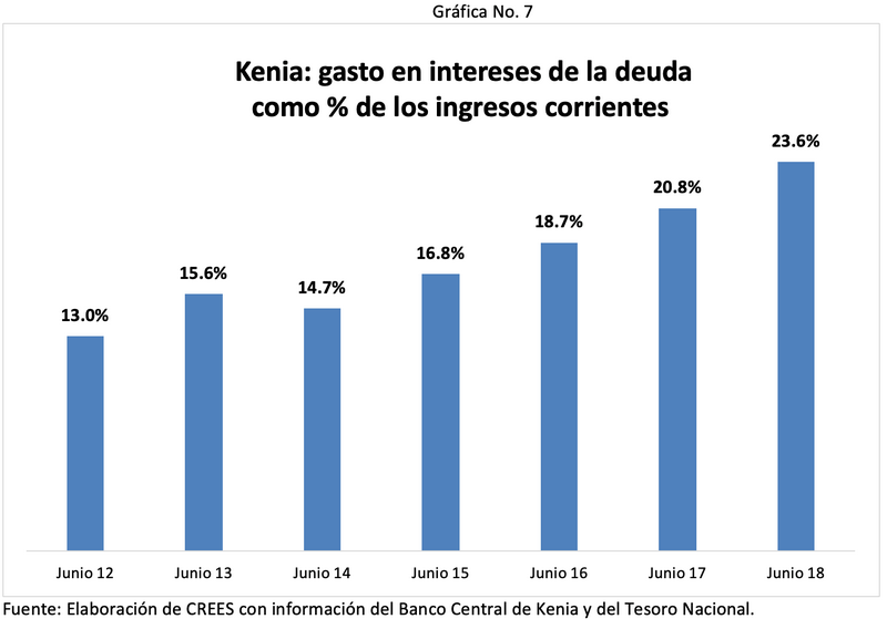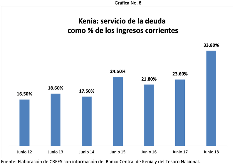 De hecho, el principal acreedor de Kenia es la República Popular China, país con el que mantiene el 22.0% de su deuda pública[8]. De acuerdo con la Tesorería Nacional de Kenia, el gasto en intereses como porcentaje de los ingresos ordinarios del gobierno pasó de 13.0% en 2012 a 23.6% en 2018. Mientras que el servicio de la deuda se incrementó de 16.5% a 33.8%, también como relación con los ingresos ordinarios (gráficas No. 7 y No. 8). El panorama fiscal de Kenia no es alentador. En 2018, la agencia clasificadora de riesgo Moody’s redujo la clasificación crediticia del gobierno de Kenia de B1 a B2 debido a las perspectivas fiscales, al aumento de la deuda pública y a la capacidad de pago de dicha deuda por parte del gobierno[9].