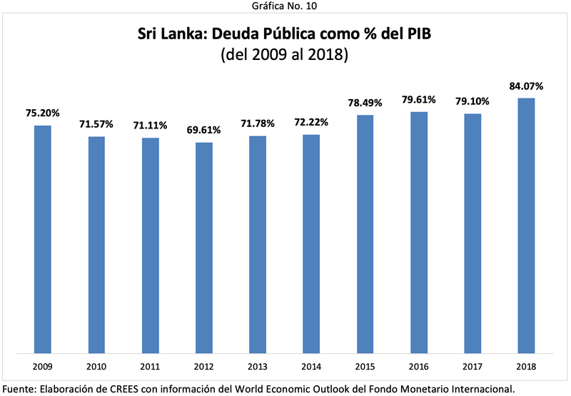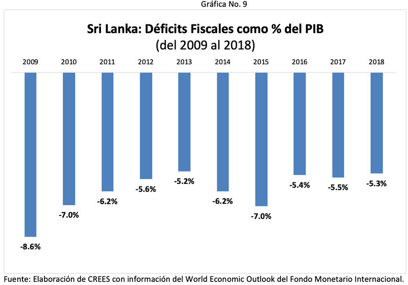 Sri Lanka, junto con Ecuador y Kenia, es otro país con ausencia de disciplina fiscal. Los déficits fiscales han promediado 5.9% del PIB en los últimos años. Como consecuencia de los déficits, la deuda pública como porcentaje del PIB aumentó de 72.2% a 84.1% en cinco años, de 2014 a 2018.