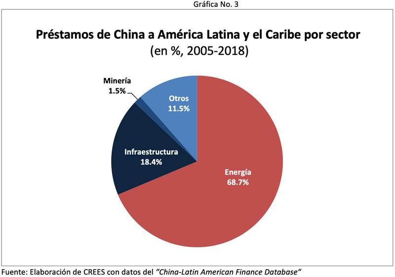 Cerca del 70% del financiamiento chino a países de América Latina y el Caribe ha sido destinado a proyectos en el área de energía. Dicho porcentaje equivale aproximadamente a US$97,000 millones. El monto en inversiones en energía es superior, ya que empresas estatales chinas del área de petróleo como son PetroChina y Sinopec, por ejemplo, han destinado recursos a varios países de la región. Sin embargo, esa información no está disponible.