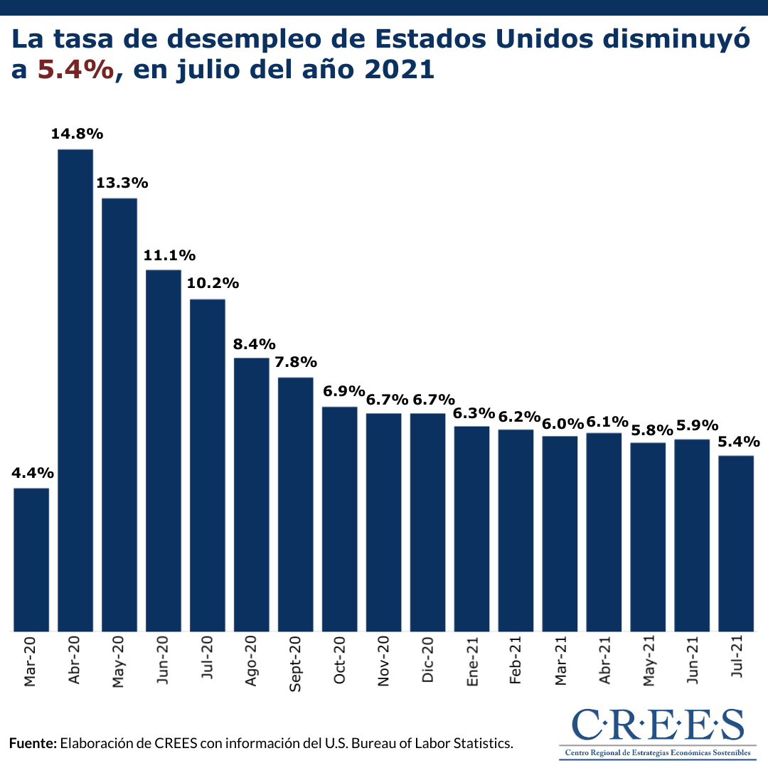 En julio de 2021, la tasa de desempleo de los Estados Unidos aumentó a 5.4%. Según el Departamento de Trabajo de Estados Unidos, el número de desempleados se redujo a 8.7 millones de trabajadores. Esto significa una reducción de 4.8 puntos porcentuales con respecto a la tasa de desempleo prevaleciente en julio del 2020.