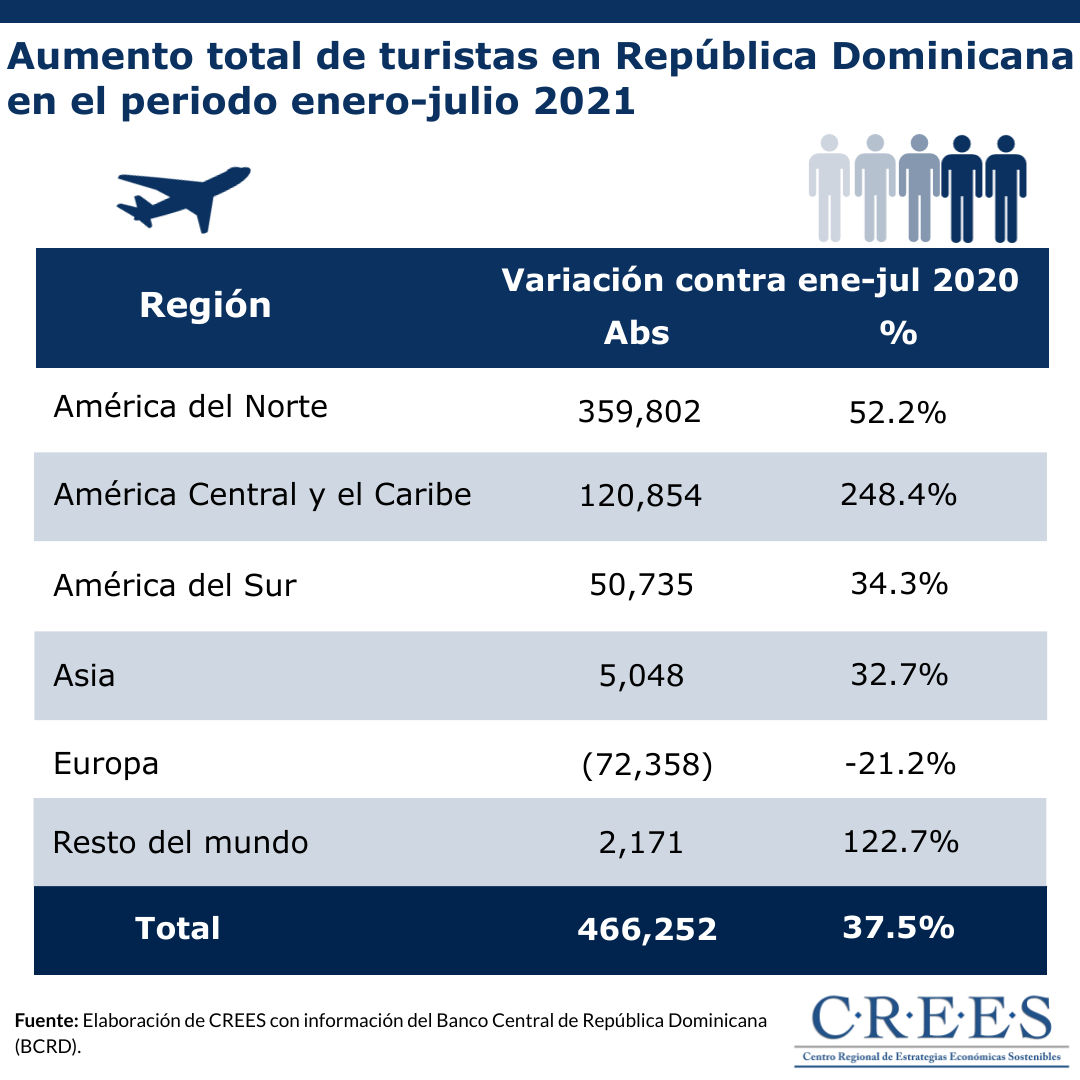 Es preciso mencionar que, a julio de 2021 se registraron 2,461,630 visitantes no residentes, es decir, tanto extranjeros como dominicano que ingresaron al país por los diferentes aeropuertos internacionales. Esta cifra significa una diferencia de 932,376 visitantes más con respecto al mismo periodo del 2020 y una diferencia de 1,705,016 menos con respecto al mismo periodo del 2019.
