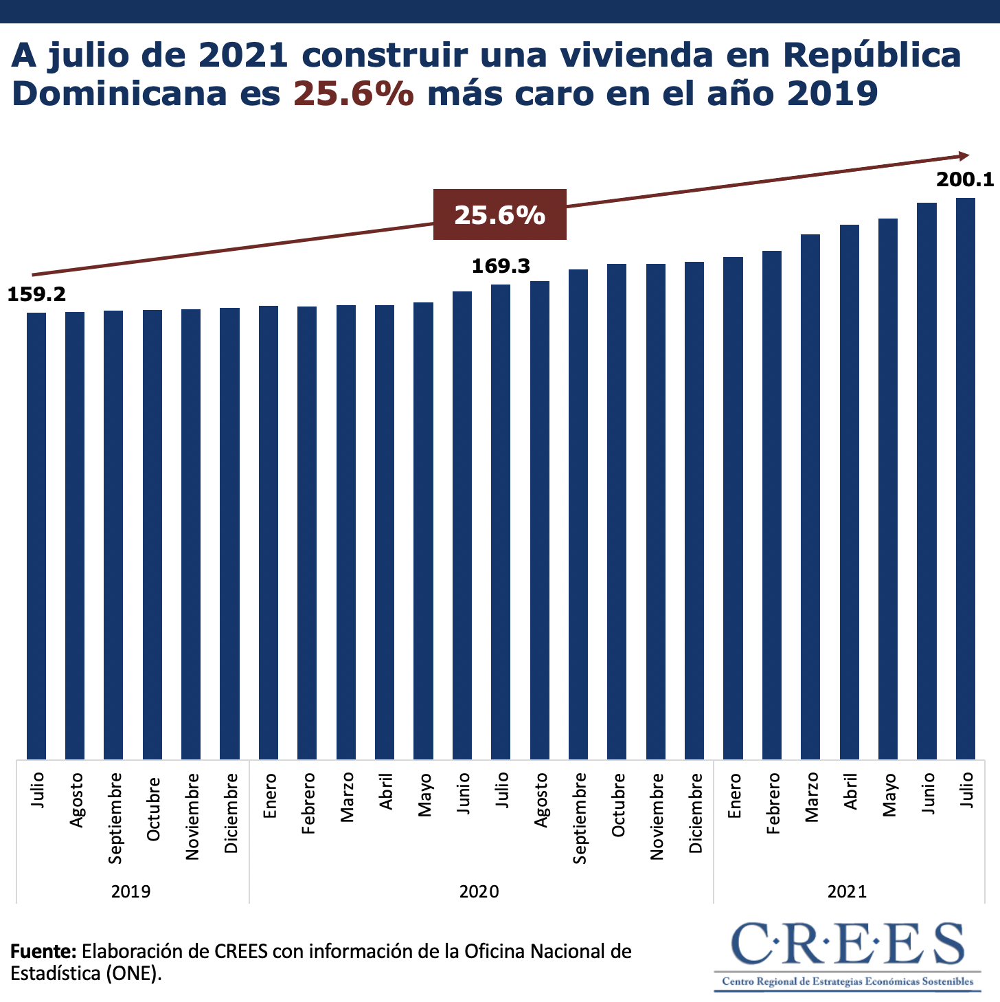En julio del 2021, el Índice de Costos Directos de la Construcción de Viviendas (ICDV) fue de 200.1, en promedio, reflejando una incremento interanual de 18.2%. De igual forma, con respecto al mismo mes del año 2019 presentó un incremento de 25.6%. En otras palabras, actualmente construir una vivienda en República Dominicana es 25.6% más caro en el año 2019.