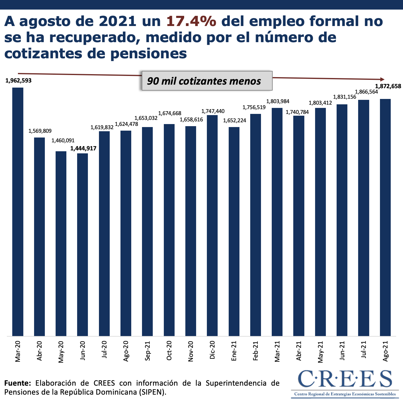 Desde junio de 2020, mes donde se percibió la mayor perdida de cotizantes debido al impacto de la pandemia, al cierre de agosto del 2021 los fondos de pensiones han recuperado unos 428 mil cotizantes. Sin embargo, aún se encuentran 90 mil cotizantes por debajo del nivel prevaleciente al inicio de la pandemia. Esto, en comparación con la pérdida de cotizantes a junio de 2020, significa que un 17.4% de los trabajadores formales que perdieron su empleo por la pandemia no lo han recuperado.