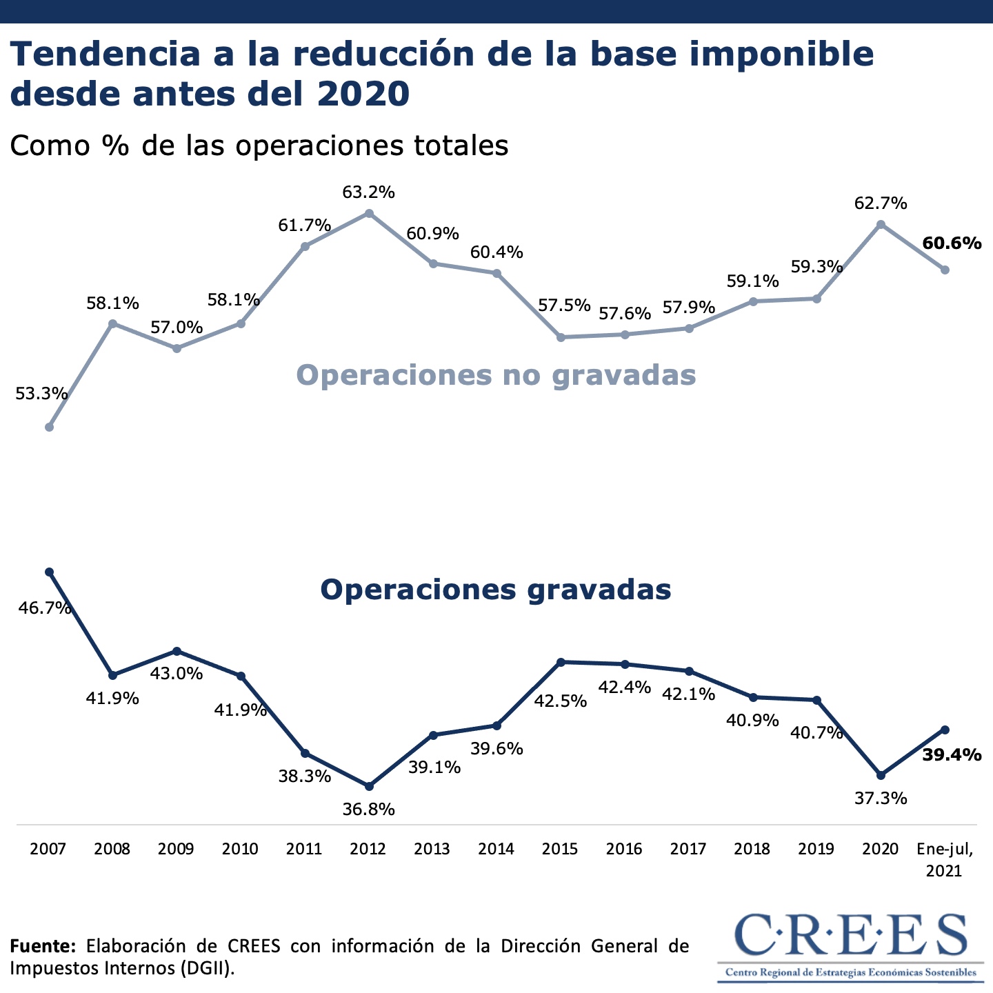 Una mirada a la evolución de las operaciones gravadas y no gravadas del ITBIS nos permite observar como la de operaciones gravadas, es decir, la base a la que se le aplica este tributo, han ido disminuyendo en el tiempo mientras que las operaciones no gravadas han ido aumentado. En otras palabras, pone en evidencia la tendencia a la reducción de la base imponible desde antes del 2020.