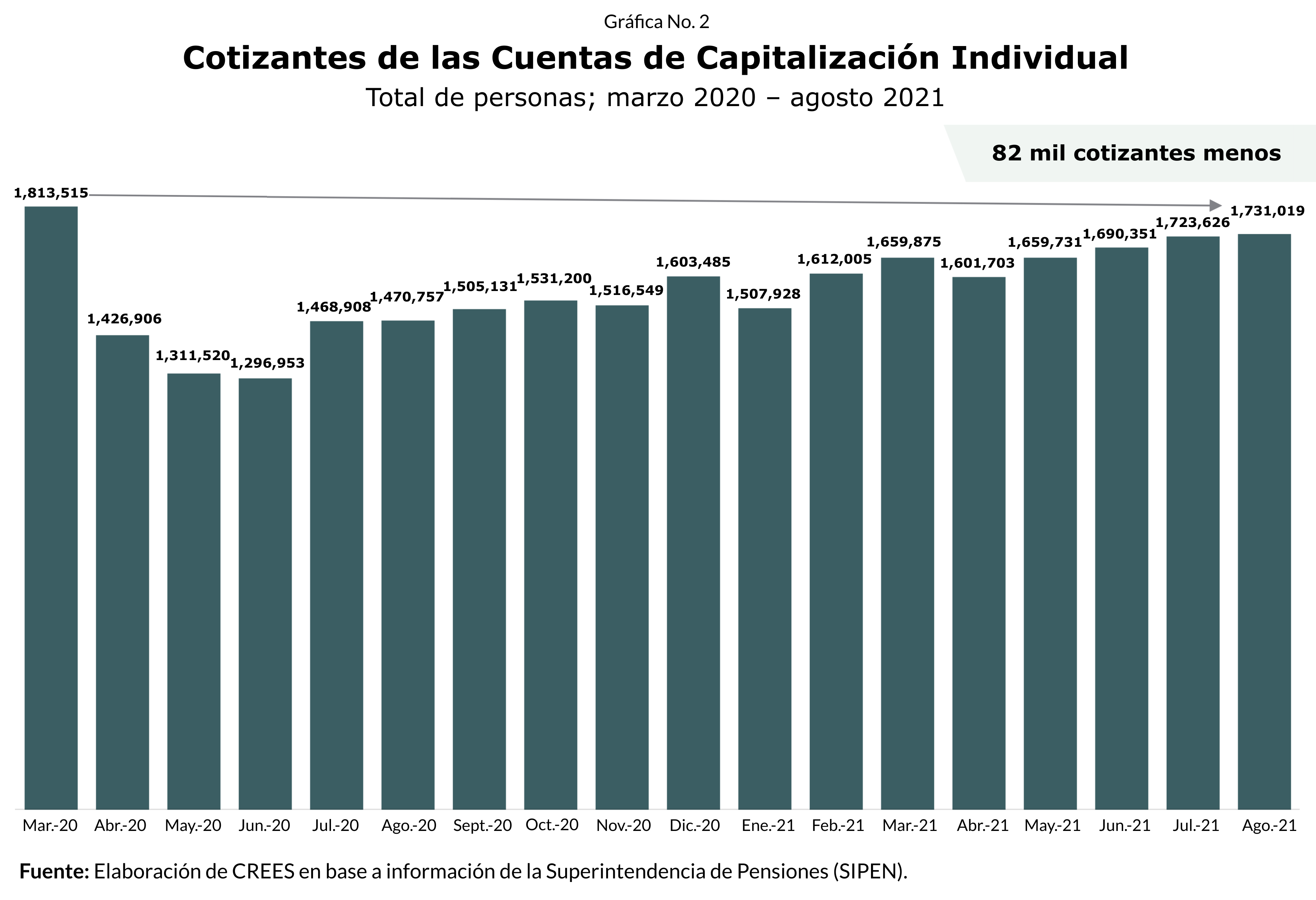 En adición a esto, desde el inicio de la pandemia la cantidad de cotizantes en el sistema de pensiones, es decir, aquellos empleados que -junto con sus empleadores- aportan a sus cuentas de pensiones, ha disminuido. Como se puede apreciar en la Gráfica No. 1, mientras que en marzo de 2020 los cotizantes representaban un 47% de los afiliados, al cierre de agosto de 2021 la proporción había caído a 42%. Es decir que menos de la mitad de las personas que están afiliadas a una administradora de fondos de pensiones (AFP) está contribuyendo a su cuenta de capitalización individual.