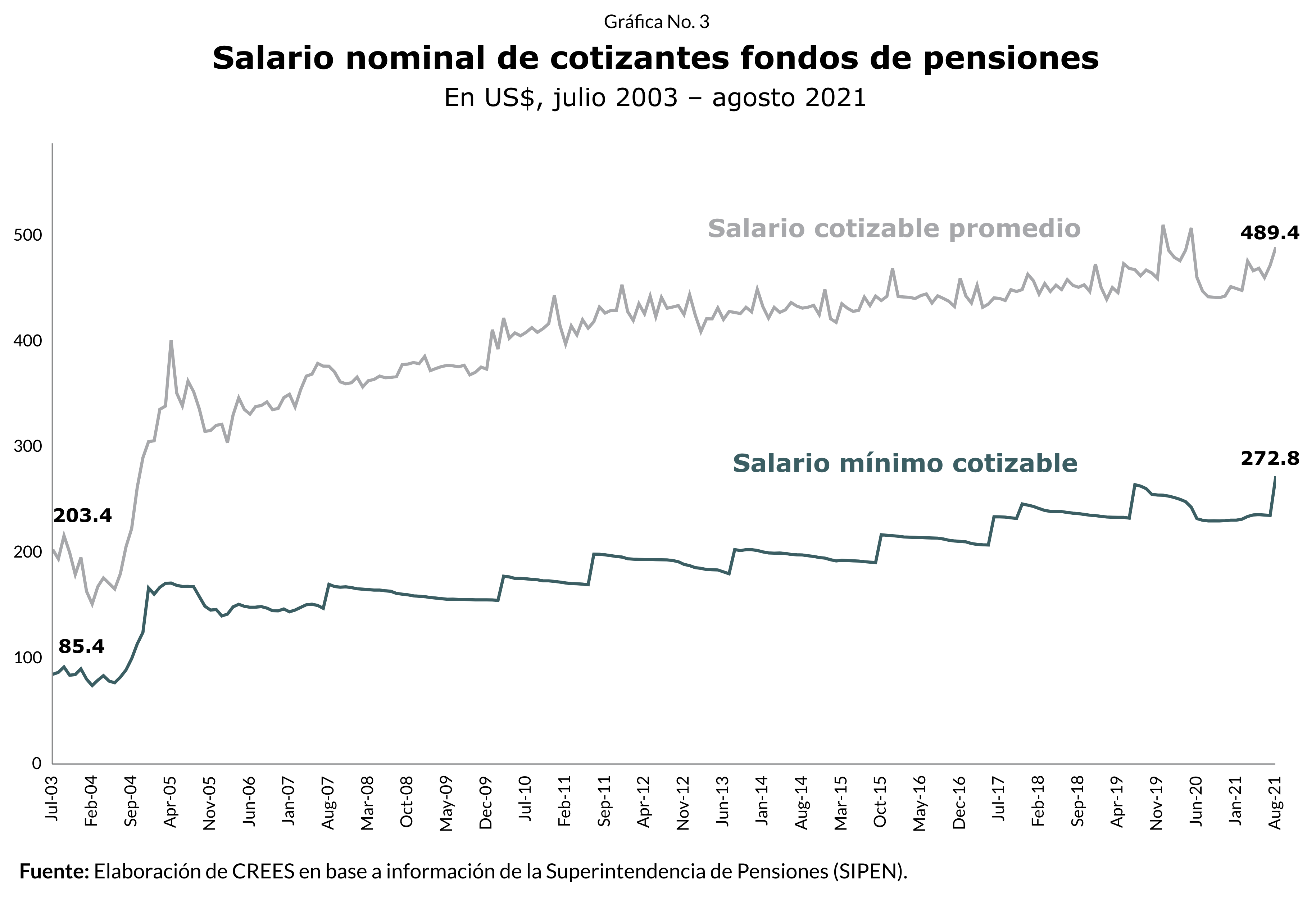 El salario cotizable promedio del sistema de pensiones, que es igual al promedio de los salarios devengados por los trabajadores que cotizan mensualmente, pasó de US$203.4 en julio del 2003 a US$489.4 en agosto de 2021, esto significa que se a incrementado en 2.4 veces su valor desde el inicio del sistema. Sin embargo, el mismo se ha quedado estancado dentro del mismo rango desde el año 2009 (Ver Gráfica No. 3). Más aún, como se puede apreciar en la Gráfica No. 4, en comparación con el promedio de países de América Latina con CCI, República Dominicana se encuentra muy por debajo.