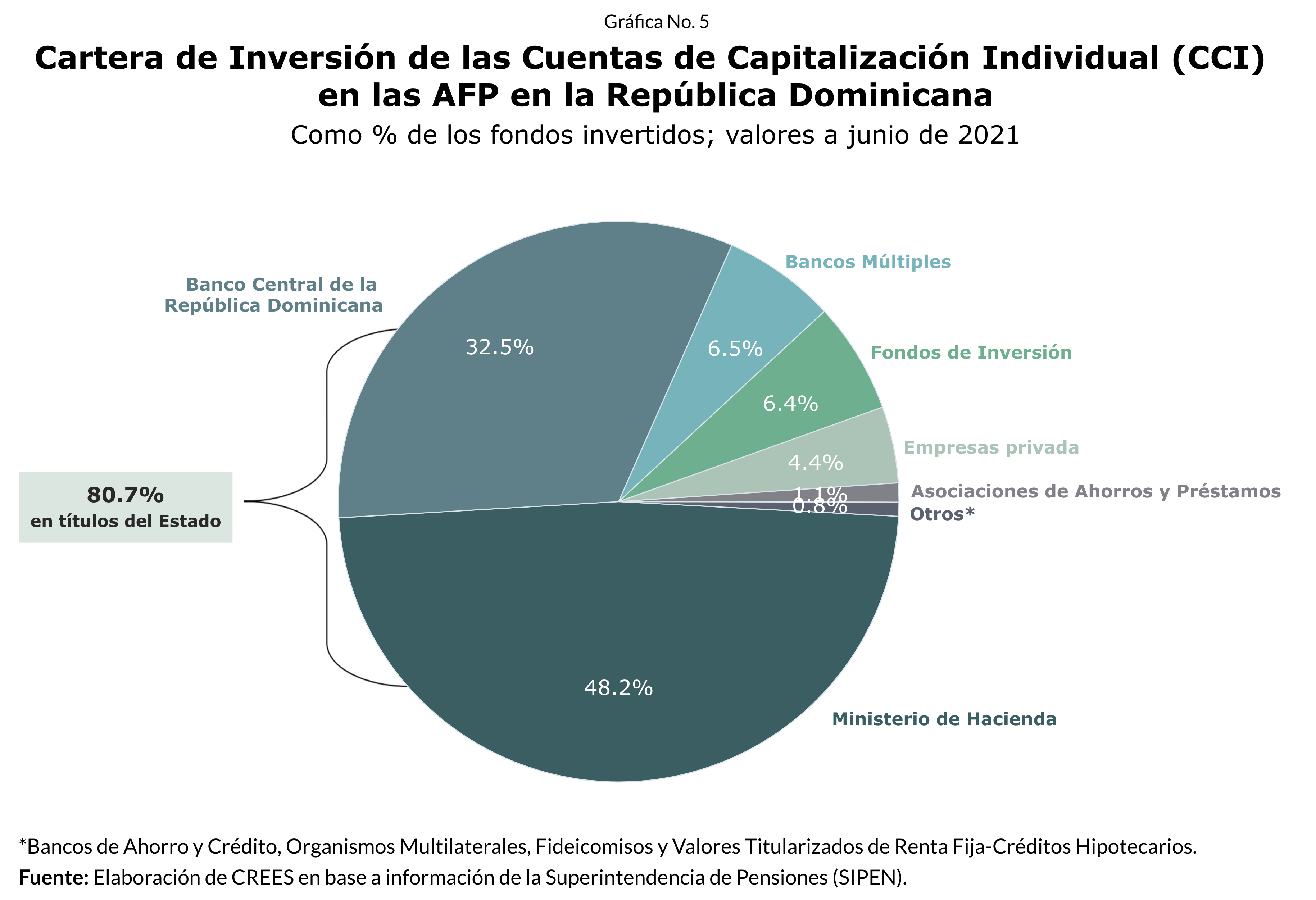 De la manera en que funciona el sistema de CCI es que las AFP invierten los ahorros de los trabajadores. Una mirada a la composición de la cartera de inversión de las CCI en las AFP nos muestra que, al 30 de junio del 2021, un 48.2% de los ahorros de los trabajadores está invertido en títulos del ministerio de hacienda y un 32.5% del Banco Central de la República Dominicana (BCRD). Es decir, el 80.7% de los fondos de pensiones se han convertido en recursos para financiar los déficits fiscales y cuasi-fiscales. Esto significa que los fondos del sistema de pensiones no están siendo empleados para financiar proyectos productivos y los requerimientos permanentes de emitir nueva deuda impiden que se adopten las medidas para que otros emisores de títulos participen en el mercado.